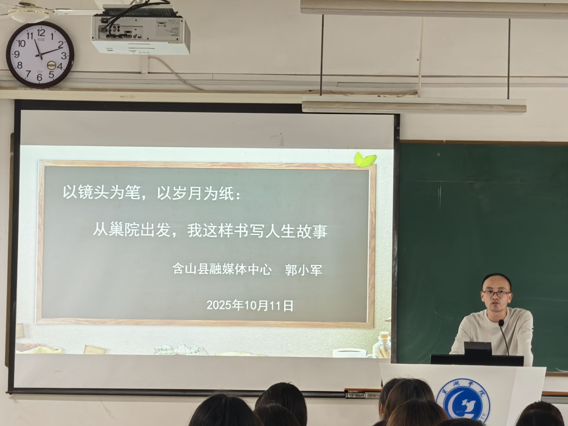 为助力学生拓宽就业与创业视野、进一步强化核心竞争力,10月12日上午,文学与传媒学院在慎思楼北103教室举办校友论坛讲座。此次讲座特邀含山县融媒体中心舆论监督部主任、学院汉语言文学教育专业2006届校友郭小军担任报告人,以“以镜头为笔,以岁月为纸:从巢院出发,我这样书写人生故事”为主题。2024级、2025级网络与新媒体专业学子参加活动,活动由学院副院长王宇明主持。