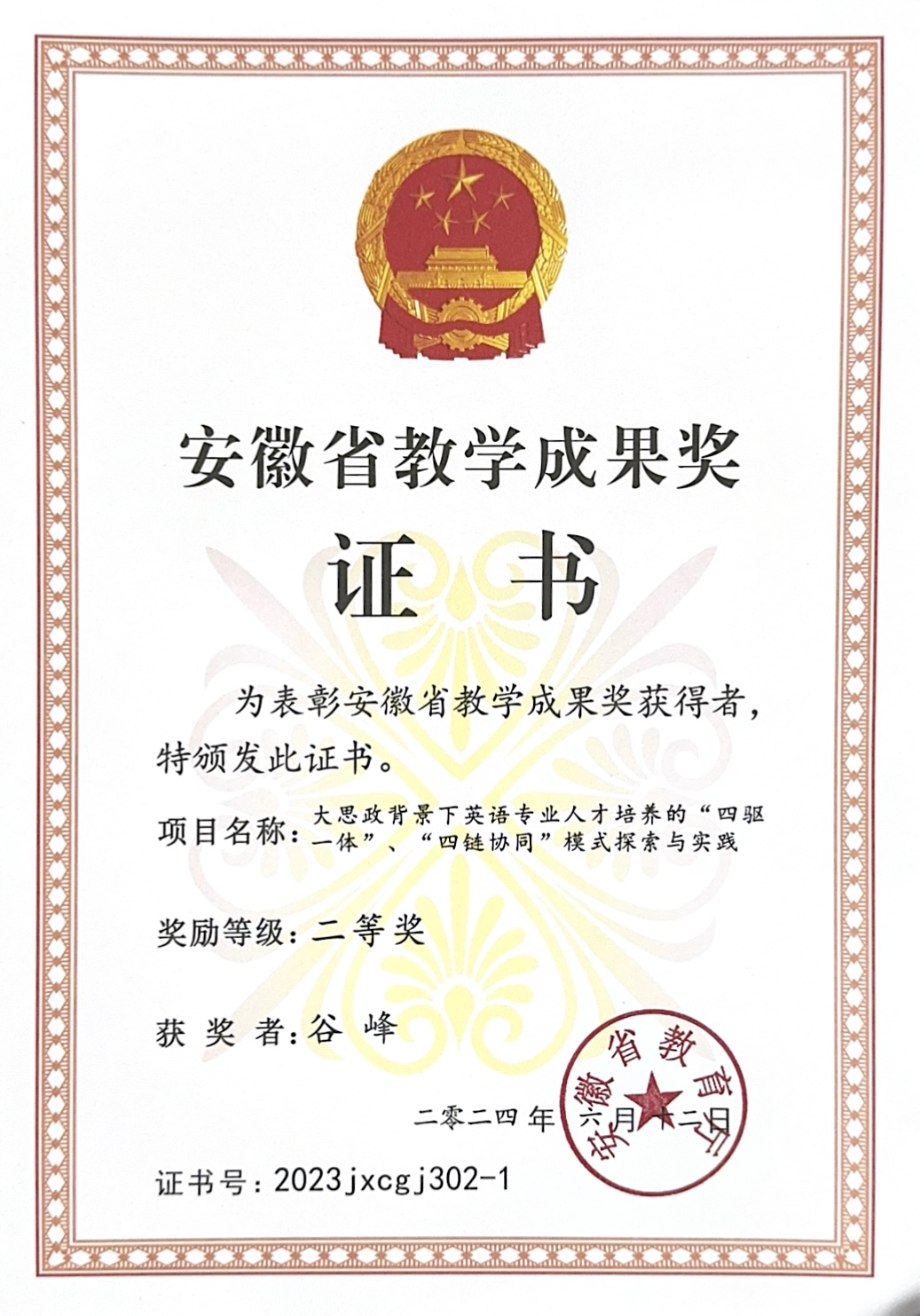 近日,安徽省教育厅公布了2023年度安徽省高校教学成果奖评选结果,外国语学院谷峰教授主持的“大思政背景下英语专业人才培养的‘四驱一体’、‘四链协同’模式探索与实践”喜获二等奖。