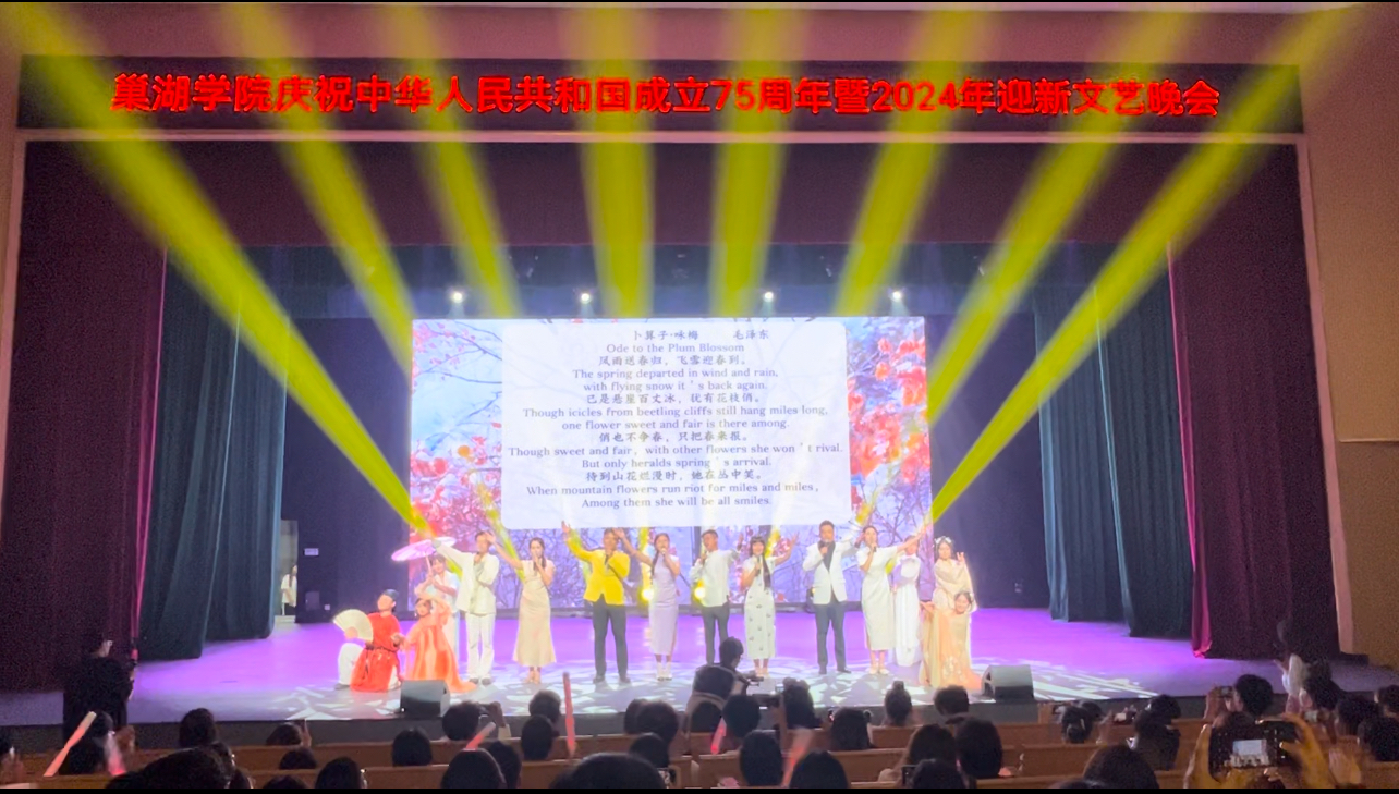 经过校团委有关领导和老师的指导、推荐,外国语学院的朗诵《诗意中国》节目参加了巢湖学院举办的庆祝中华人民共和国成立75周年暨2024年迎新文艺晚会。《诗意中国》巧妙地将汉语诗歌与外语朗诵相结合,观众仿佛漫步在时光的长河中,穿越四季的变幻,深入探寻中国文化的深邃与瑰丽。表演现场,外国语学院师生通过中、英、俄、法多语种朗诵的形式,表达对祖国热烈而真挚的爱。