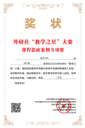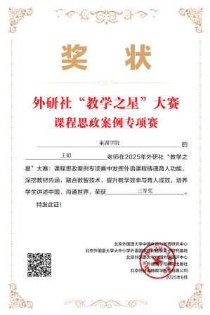 近日,2025 年外研社 “教学之星” 大赛课程思政案例专项赛评选结果揭晓,巢湖学院外国语学院教师凭借卓越教学设计与创新思政教育理念,在激烈竞争中脱颖而出,斩获佳绩。王友情获全国一等奖,王钢、王娟(小)、郭佳鑫分获全国三等奖。